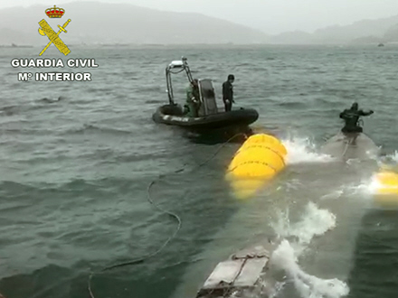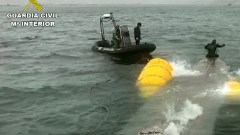 Guardia Civil, Policía Nacional og skattemyndighederne har allerede opbragt ubåden, der blev opdaget lørdag et par sømil fra stranden i Hío i Morrazo-regionen, Pontevedra.