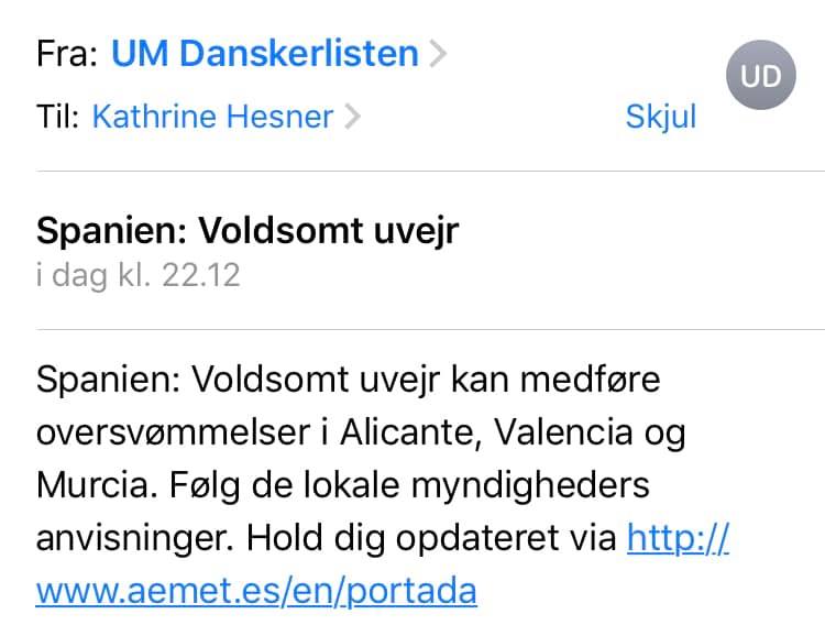 Formålet er, at den lokale ambassade kan sende informationer om, hvordan du bør forholde dig, når der opstår eksempelvis farlige vejrsituationer, som vi ser lige nu i Alicante, Valencia og Murcia.
