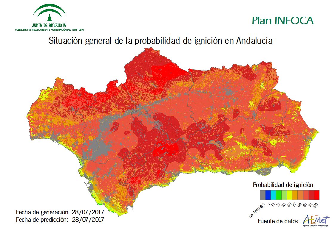 De høje temperaturer øger i sagens natur også risikoen for skovbrande, så vi må ikke så meget som tænke på åben ild i disse tider. Bare Andalusien ser sådan her ud: