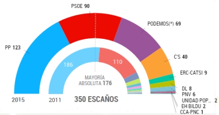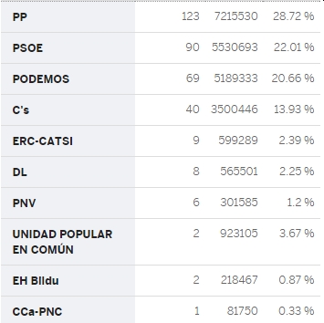 Som aftenen skred frem blev det mere og mere klart, at Spaniens hidtidige ‘biopartismo’ - som alle havde ventet - er slut. Med begrebet bipartismo menes, at enten havde PP eller PSOE gennem mange år haft absolut flertal til hver for sig at kunne regere enerådigt. Som PP har kunnet de seneste fire år.
