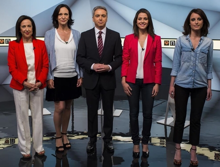 Margarita Robles (PP), Carolina Bescansa (Podemos), ordstyreren Vicente Vallés, der ikke kunne styre noget som helst, Inés Arrimada (Ciudadanos) og Andrea Levy (PP)
