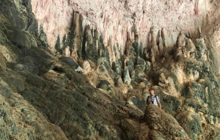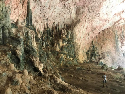 Pludselig står vi i en stor, åben drypstenshule ‘La ermita de Garganta Verde’. Her er klippevæggen skiftevis helt mørkegrøn eller pink.