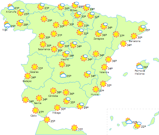 Ud over varme er der i dag nulighed for lokalt kraftige regn- og tordenbyger i Teruel, det østlige Castilla-La Mancha og de indre egne i Valencia.