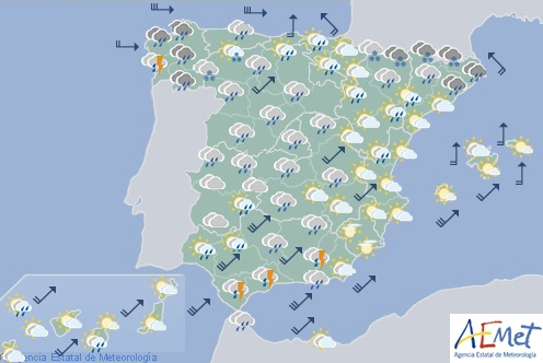 Generelt advares der om lokalt vedholdende og/eller stærk nedbør i store områder af de indre, sydlige og vestlige egne af halvøen samt i Pyrenæerne. Nogle gange bliver hele herligheden krydret med hagl og torden.