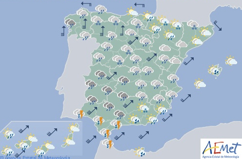 Nedbøren er vedholdende, lokalt tung og ledsaget af torden i de nordlige områder af Extremadura, det sydlige Andalusien, Galicien og den vestlige ende af Strædet.