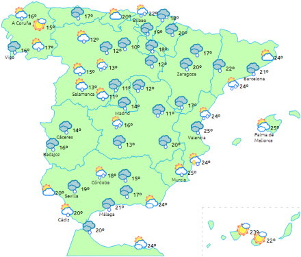 Lokalt tung eller vedvarende i det vestlige Galicien, bjergene i de indre egne, Extremadura, Castilla-La Mancha, Navarra, Huesca og Lleida. Der forventes også meget nedbør og torden i Andalusien, Strædet , Pyrenæerne, det østlige Catalonien og Balearerne.