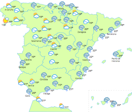 Ustabilt vejr forventes i Middelhavsområdet med vedvarende regn, lokalt stærke eller meget stærke og med torden i Valencia-regionen, Catalonien, Balearerne, Andalusien, Extremadura, det sydlige Aragón og nærliggende områder.
