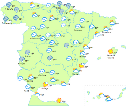 I næsten hele landet forventes letskyet til klar himmel afbrudt af perioder med højtliggende skyer. Kun i den nordlige del af Navarra og Pyrenæerne kan der være noget svag nedbør i begyndelsen af dagen, men det har tendens til at ophøre i løbet af formiddagen.