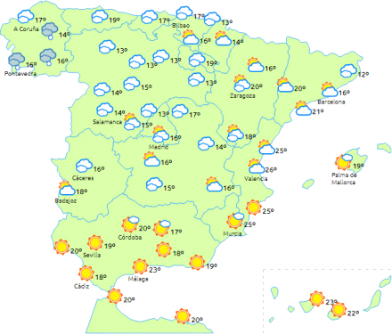 Klar himmel undtagen lavthængende skyer om morgenen i de indre egne. Stigende temperaturer på 19 til 21 grader og 11 til 16 i nat. Dog skal sommertøjet virkelig findes frem i Málaga og Vélez-Málaga, hvor vi kommer helt op på 26 til 27 grader i dag!