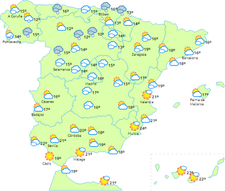 Overskyet med nedbør på den nordlige del af halvøen, men dog mest udbredt i de cantabriske og vestlige Pyrenæer, hvor de lokalt kan være vedvarende og med lejlighedsvis torden.
