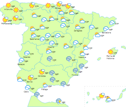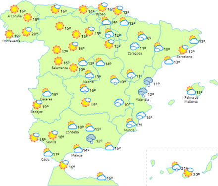 Faldende dagstemperaturer på den sydøstlige del af halvøen og Balearerne, mens de stiger i vest og på De Kanariske Øer. Frostgrader i Pyrenæerne og lokalt i bjergene i centrum og sydøst.