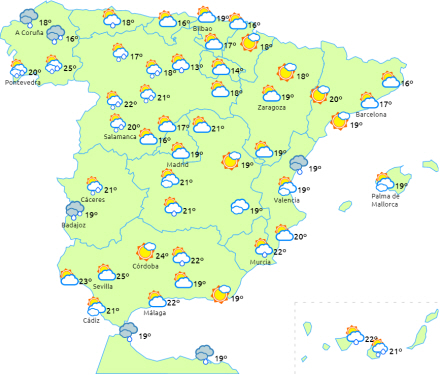 I det nordvestlige af Pyrenæerne og den sydlige halvdel af halvøen tiltagende skydække i løbet af dagen og sandsynlighed for spredte byger i eftermiddag i Galicien, Asturias, det nordvestlige af halvøens indre egne og bjergene i Extremadura og Andalusien.