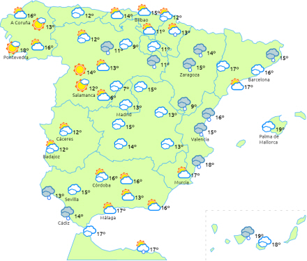Faldende temperaturer på De Kanariske Øer og i det vestlige Andalusien, få ændringer i resten af Middelhavsområdet og stigende på resten af halvøen, hvilket særligt kan mærkes i de indre områder. Svag frost i begyndelsen af dagen i bjergene på den nordlige og østlige del af halvøen.