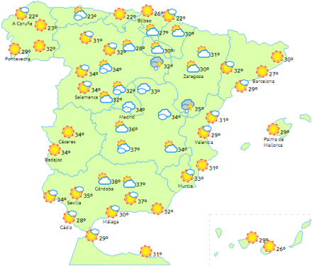 Stigende temperaturerne til den nordøstlige tredjedel af halvøen samt sydøstkysten og på De Baleariske Øer, men ellers generelt fald i resten. Vi ligger ret højt selv for årstiden med over 36 grader på den sydlige Atlanterhavsside, dalene Duero og Ebro samt på De Kanariske Øer.