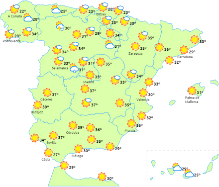 Generelt faldende maksimumstemperaturer undtagen ved nordvestkysten, den østlige middelhavskyst, den vestlige del af Andalusien og øgrupperne, hvor de har tendens til at stige. Det er sandsynligt, at vi igen overstiger 35 grader i dalene Ebro og Guadalquivir, det vestlige af Extremadura og lokalt i de indre egne af Galicien.