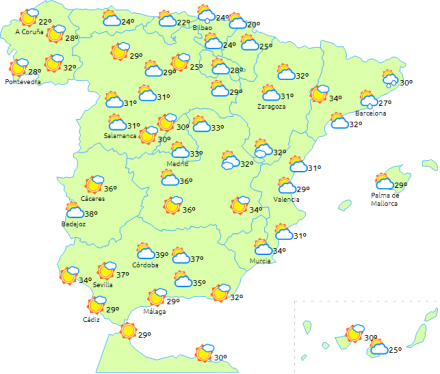 Højtliggende skyer i perioder og sandsynlighed for tågebanker ved kystten i slutningen af dagen. Generelle temperaturfald, der lokalt er særligt bemærkelsesværdige i maksimumniveuerne. Dermed havner vi på 33 til 36 grader og 20 til 25 i nat.