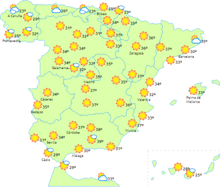 Faldende dagstemperaturer til store dele af den nordlige del af halvøen, mens de er stigende i Middelhavsområdet og den sydvestlige del af halvøen. Niveauerne er meget høje på det meste af halvøen og Balearerne, men især på den nordøstlige del af halvøen, det sydlige Andalusien og Mallorca. Nætterne bliver lidt lunere i Cantabrien og i øst, mens de bliver svalere på den vestlige del af halvø.