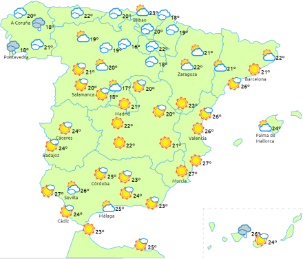 Lavthængende skyer eller morgentåge til de nordlige, indre egne, i Galicien og Asturien.
