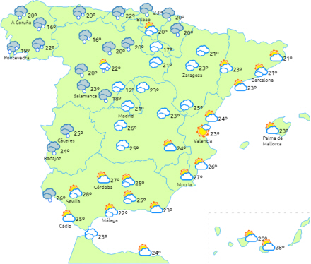 Temperaturer uden væsentlige ændringer på 23 til 25 grader og ni til 15 i nat. Let vind primært fra øst og syd.