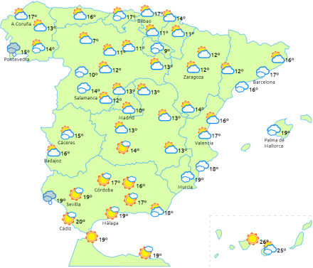 Store dele af landet vil have letskyet himmel, men efterhånden vil en ny Atlanterhavsfront nærme sig den nordvestlige del af halvøen, og det giver tiltagende uklarhed i den vestlige tredjedel og nedbør i den vestlige del af Galicien - lokalt vedholdende.