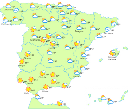 Faldende dagstemperaturer på den østlige og centrale del af halvøen - især i Middelhavsområdet. På De Kanariske Øer er de stigende. Generelt bliver nætterne lidt køligere undtagen i områder på den sydlige tredjedel af halvøen og på De Kanariske Øer, hvor der ikke forventes store ændringer. Vi kommer igen over 34 grader i Guadalquivir og det indre af Cádiz.