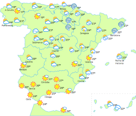 Skyet og i løbet af dagen overskyet ved nordvestkysten, det nordlige og østlige Castilla y León, De Iberiske Randbjerge, Ebro-dalen, Navarra og Pyrenæerne med regn og torden, som lokalt kan være ret heftigt.