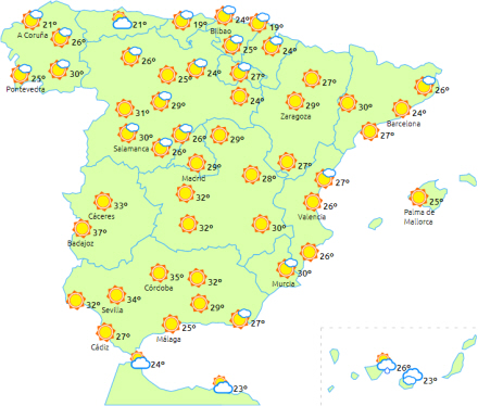 Stabilt vejr til det meste af landet med overvejende letskyet eller klar himmel. Der forventes imidlertid perioder med lavthængende skyer over det nordlige Galicien, nordvestkysten og lokalt i strædet og den sydøstlige del af halvøen.