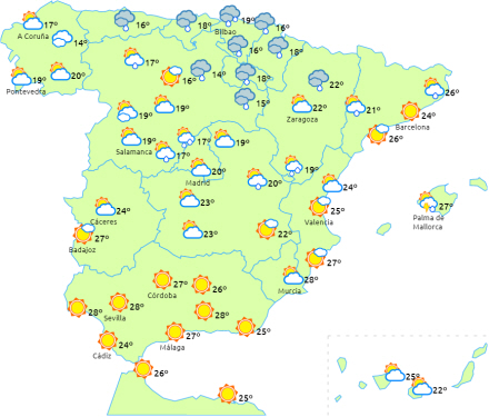 På resten af halvøens indre egne forventes der overskyet himmel i løbet af dagtimerne og letskyet himmel ved Middelhavskysten og det sydlige Andalusien.