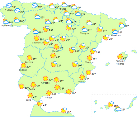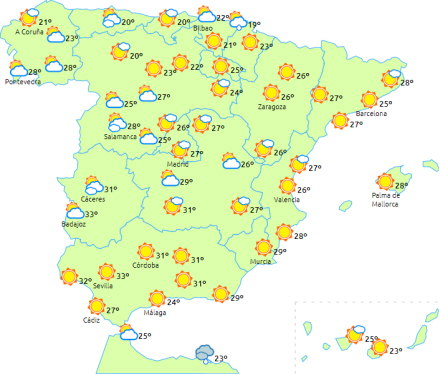 Overvejende tørt og stabilt vejr til det meste af landet. Der forventes kun svag regn i Melilla og Stræde-området samt svage byger i eftermiddag i de østlige Pyrenæer og muligvis også i andre bjergrige områder i de nordlige og østlige af halvøen. Muligvis også noget svag regn i de centrale timer i den østlige ende af nordvestkysten.