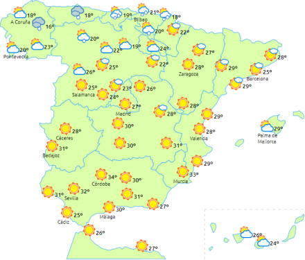 Perioder med overskyet himmel over de nordlige egne af De Kanariske Øers højtliggende dele, og det samme i begyndelsen af dagen til den sydlige halvdel af Middelhavsområdet på halvøen.