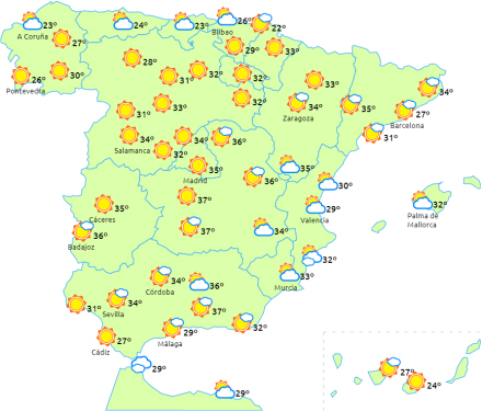 Temperaturerne stiger i hele landet undtagen i Galicien, ved nordvestkysten, i det vestlige Andalusien og på De Kanariske Øer, hvor de vil forblive uændrede. Temperaturerne vil overstige 34 til 36 grader i store dele af halvøens indre egne og på Mallorca, mens vi kommer op på omkring 38 til 40 grader i de lavtliggende egne på den sydlige Atlanterhavsside og i Ebro-dalen.