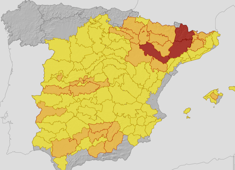 Temperaturerne har tendens til at stige i det meste af den østlige og sydlige del af fastlandet og på Balearerne. Temperaturen kan overstige 36 til 38 grader i store dele af halvøens indre egne og på Mallorca samt 40 til 42 grader i lavtliggende egne på den sydlige Atlanterhavsside og i Ebro-dalen.