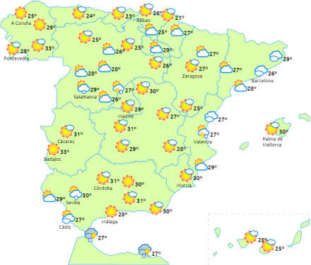 I begyndelsen af dagen vil der herske tørt og solrigt vejr med letskyet himmel. Der forventes dog fortsat lidt ustabilt vejr her og der med mellem- og højtliggende skyer og efterhånden tiltagende skydække i store dele af halvøens indre egne, Balearerne, Gibraltarstrædet og Alboran.