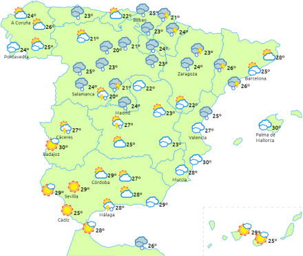 Dagstemperaturerne stiger på Atlanterhavssiden og den nordlige tredjedel, mens de falder på den sydøstlige del af halvøen og resten af halvøen med små ændringer. Dagstemperaturerne kan nå op på 34 grader i Guadalquivir og lokalt i dalene på resten af den sydlige Atlanterhavsside.