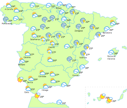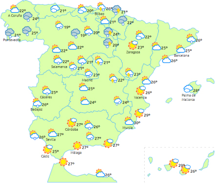 Temperaturerne vil falde på halvøen og Balearerne - især i halvøens indre egne - mens den vil stige en smule på De Kanariske Øer, det vestlige Galicien, i området omkring Gibraltarstrædet og Girona.