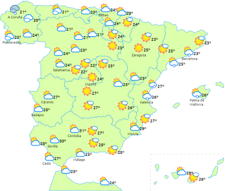 Der forventes stabilt vejr til det meste af halvøen med letskyet himmel eller højtliggende skylag. På halvøens østkyst og på Balearerne vil der dog være overskyet vejr, og der forventes byger.