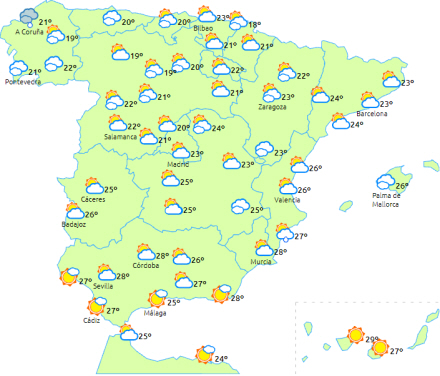 Dagstemperaturerne stiger i den nordøstlige tredjedel af halvøen, mens de falder i Galicien og det vestlige Andalusien og kun ændrer sig lidt i resten. Nattetemperaturerne sker der ikke meget med.