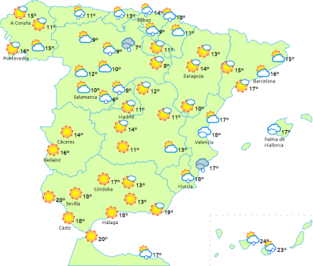 Skyet vejr på Balearerne, i Den Valencianske Golf og det nordøstlige Catalonien med byger, der lejlighedsvis kan ledsages af tordenbyger, som kan blive noget kraftigere mod slutningen af dagen. Måske også lokalt kraftige byger i de nordlige dele af Balearerne.