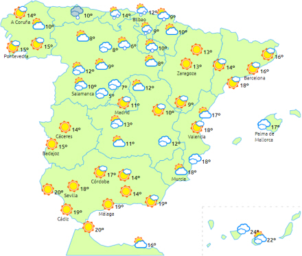 Temperaturerne falder på De Kanariske Øer, men ellers ikke væsentlige ændringer i resten af landet. Svag frost i bjergområderne og i de indre, nordlige egne.