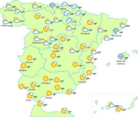 Dagstemperaturerne stiger i Pyrenæerne, falder på den sydlige halvdel og i de nordøstlige lavtliggende områder. Ellers ingen væsentlige ændringer i resten af landet. Nattemperaturerne falder på halvøen, selv om de kan stige en smule på den nordlige højslette. Kun få ændringer på øerne.