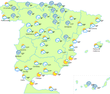 Overskyet over det meste af halvøen med nedbør, der stedvis er vedvarende ved nordvestkysten og stedvis kraftigt og af og til ledsaget af tordenvejr i den østlige del af Catalonien og de østligste af Balearerne.