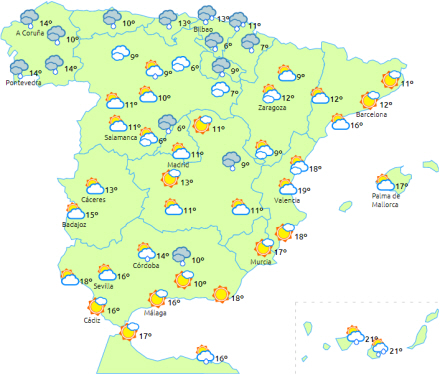 Temperaturerne vil stige mærkbart næsten overalt, undtagen på De Kanariske Øer, hvor de vil falde en smule. Svag, spredt frost i bjergområderne og mere intens og lokalt kraftig frost i Pyrenæerne.