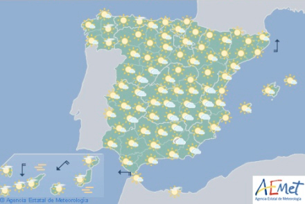 Overvejende stabilt vejr og letskyet til klar himmel over det meste af Spanien, bortset fra nogle lavthængende skyer eller morgentågebanker i det indre af Galicien, områder af Biscayabugten og Middelhavsområdet.