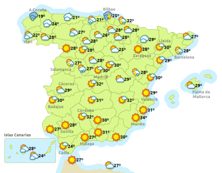 Det meste af landet får flot sommervejr, med undtagelse af de nordlige egne, hvor der kan komme regn og torden – især i Pyrenæerne og langs de baskiske kyster.