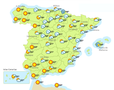 Vejret i Spanien, tirsdag klokken 14:00