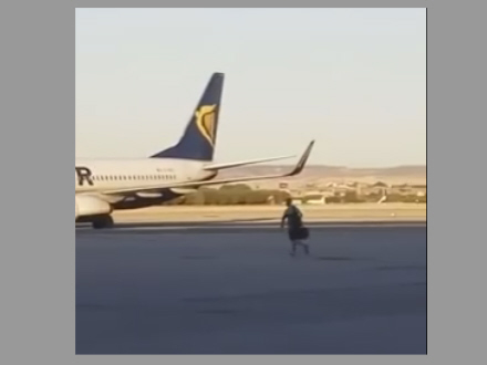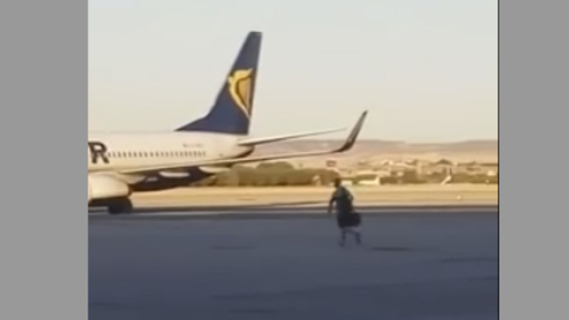 Ung mand sprang flere meter ned på landingsbanen og efter et mislykket forsøg på at nappe et lift med en bagagebil løb han på tværs af banen i et desperat forsøg på at fange flyet, før det lettede.