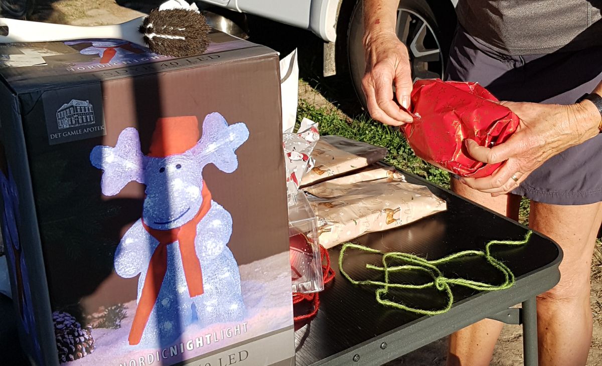 Vi havde selvfølgelig gaver i vognen; fra mig til dig og omvendt. Kate fik et par gode travesko og Peter en cykelhjelm. Lidt til hver ende af kroppen. Den 25. blev en fælles julekomsammen for alle på pladsen, hyggeligt.