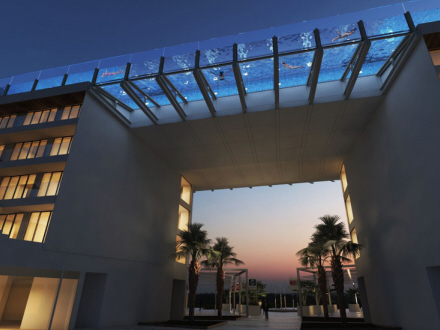 Men så har man også gjort det næsten umulige: Placeret gennemsigtige svømmebassiner oppe på og mellem to højhuse.
