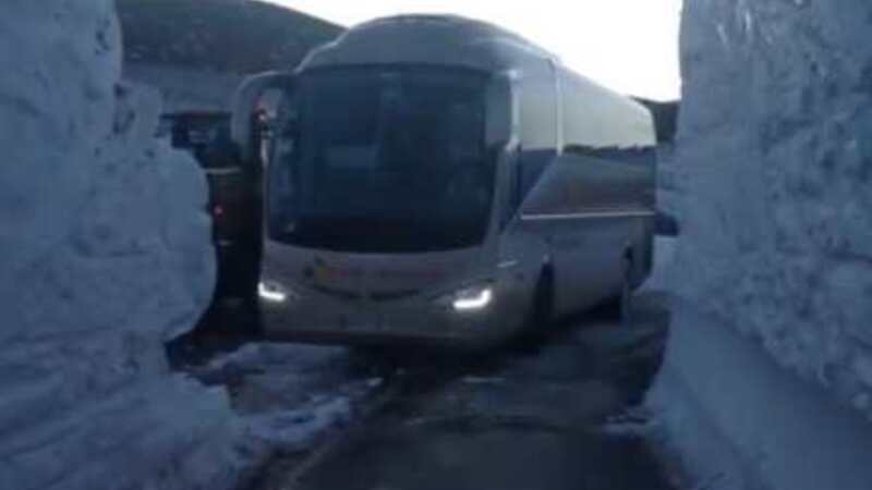 En video, der viser en chauffør der forsigtigt manøvrerer en bus gennem fire meter høje snemure på begge sider på landet i Catalonien, er blevet noget af et online hit.