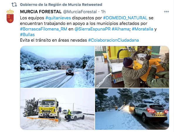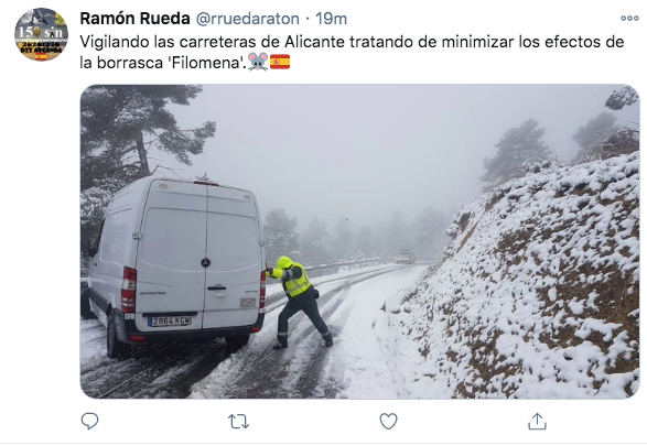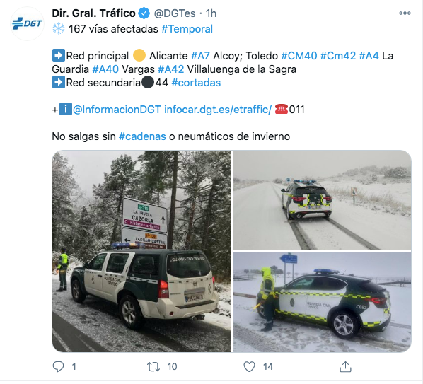 "Hvis du kan undgå det, skal du ikke køre nogen steder. Kontroller under alle omstændigheder vejret først og tilstanden af vejene", skrev DGT på twitter, hvor man i øvrigt også skrev, at man ikke skal køre nogen som helst steder, hvis ikke man har vinterdæk eller snekæder på.